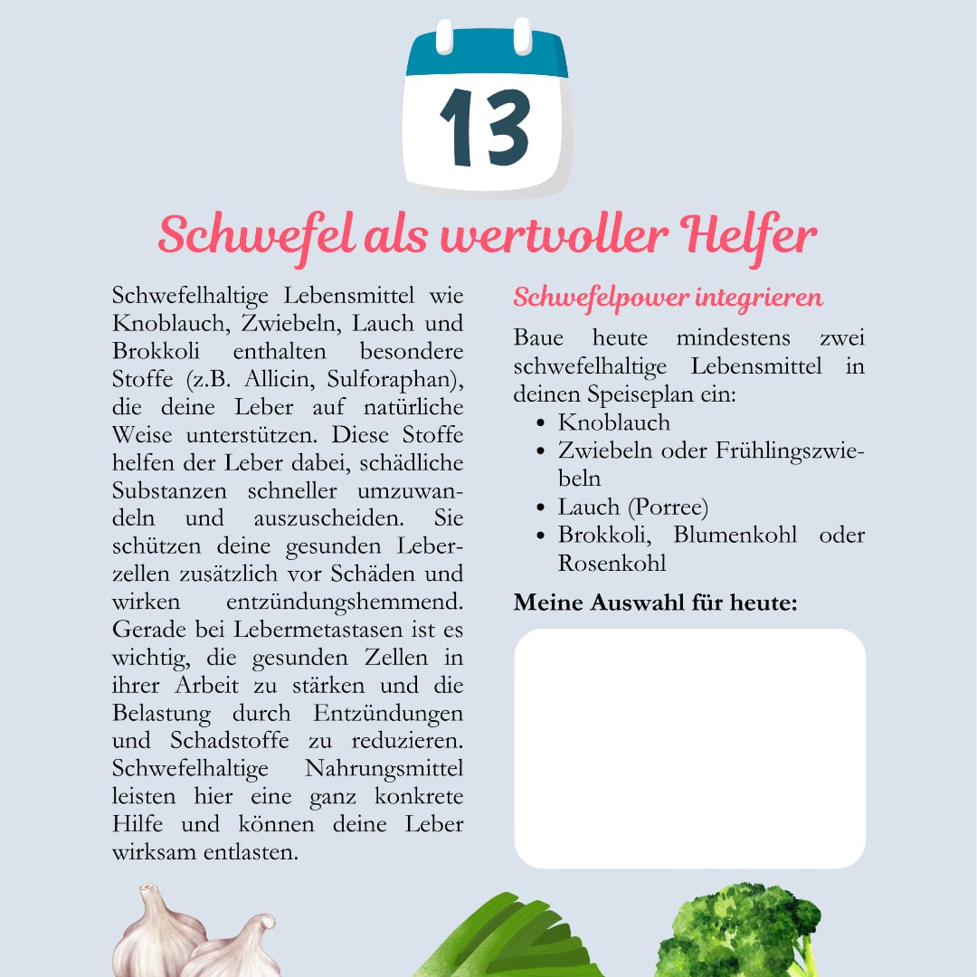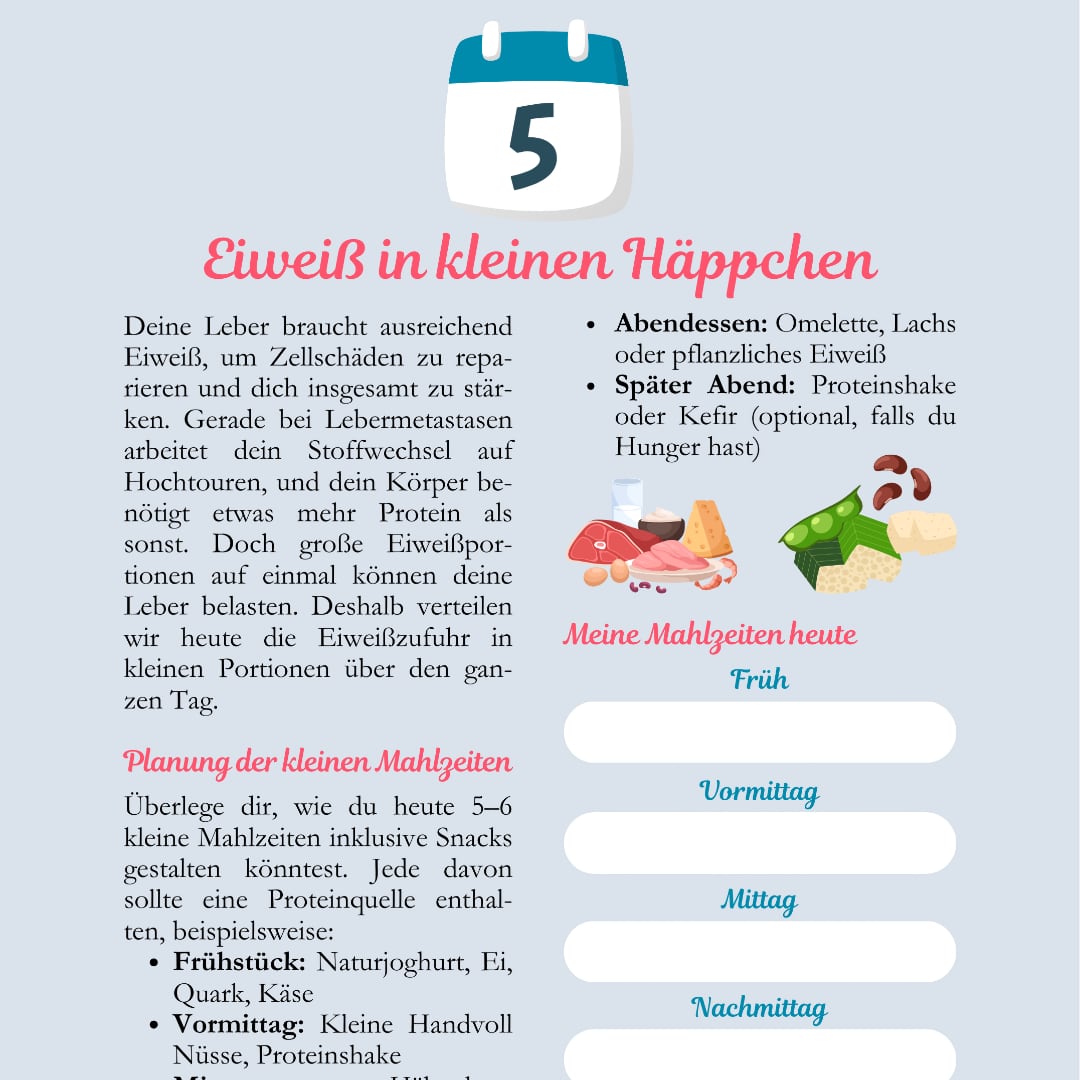 • Leber verstehen – Fakten statt Mythen: Erfahre, wie deine Leber unter deiner Krebstherapie arbeitet, was erhöhte Leberwerte bedeuten und warum Bitterstoffe, ausreichend Schlaf und sanfte Bewegung so wichtig sind.