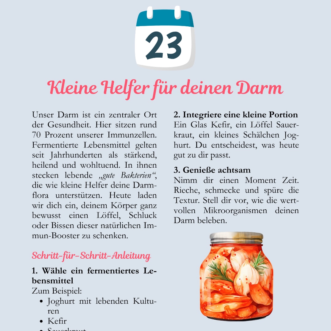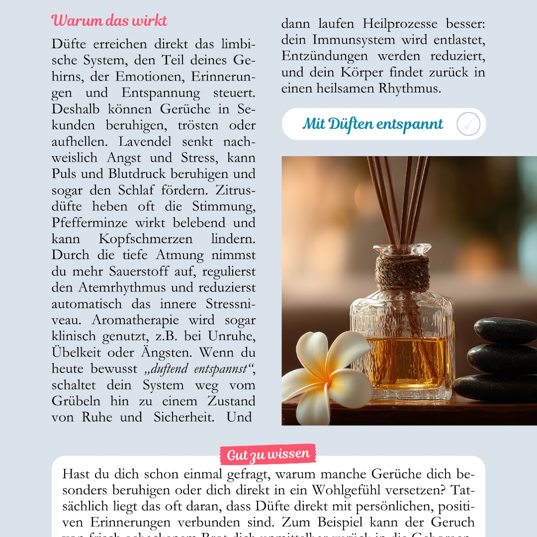 In den 28 Tagen dieses Programms wirst du lernen, deinen Körper bewusst dabei zu unterstützen, sich immer wieder aus dem Alarmzustand in die Regeneration zu bringen. Nicht durch Perfektion oder Leistungsdruck, sondern durch kleine, machbare Impulse im Alltag. Ob Atmung, Wärme, Bewegung, Genuss oder entspannende Gedanken: Alles zählt, und alles stärkt deine Selbstheilungskräfte.