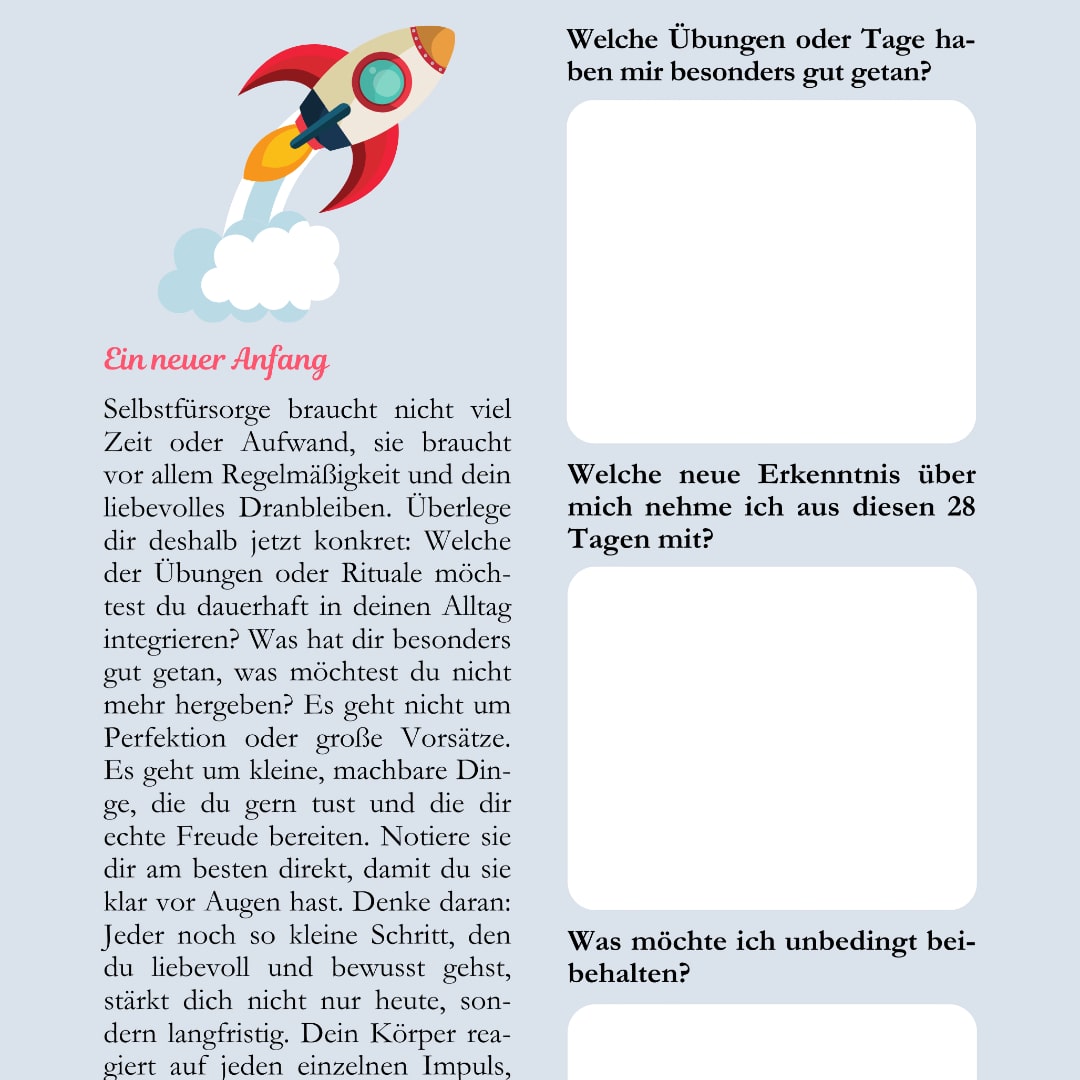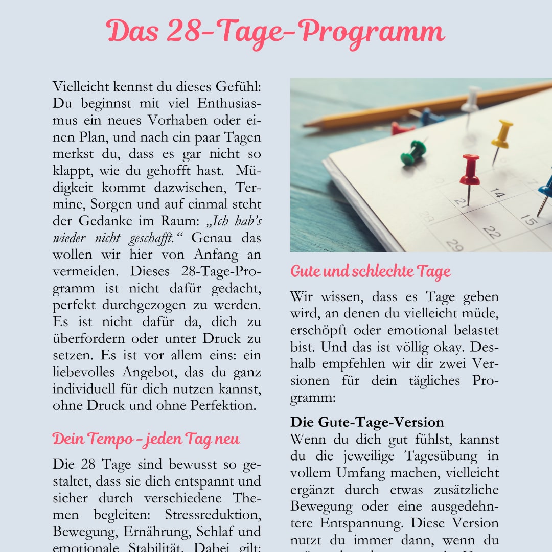 Die 28 Tage sind bewusst so gestaltet, dass sie dich entspannt und sicher durch verschiedene Themen begleiten: Stressreduktion, Bewegung, Ernährung, Schlaf und emotionale Stabilität. Dabei gilt: Du entscheidest, wie intensiv du die Übungen durchführst und was heute für dich passt. Dieses Programm ist kein Leistungstest, sondern ein persönlicher Werkzeugkasten, aus dem du täglich auswählen darfst.